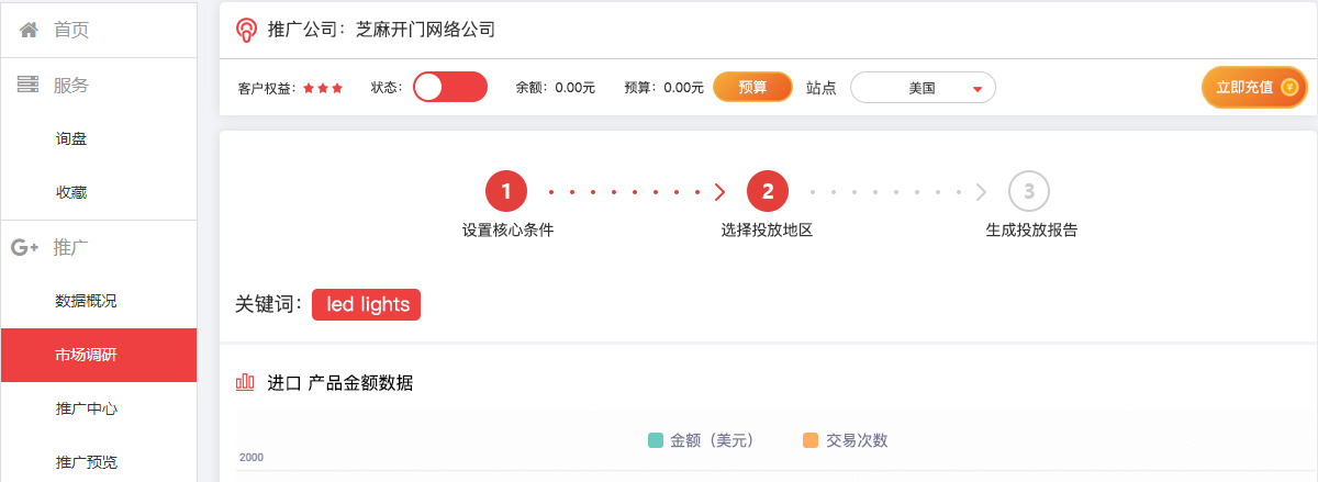 后臺直接充值即可進(jìn)行谷歌投放,內(nèi)置關(guān)鍵詞工具、推廣中心、推廣預(yù)覽、消費明細(xì)等,直接操作,不需要再去進(jìn)行谷歌開戶等操作。
